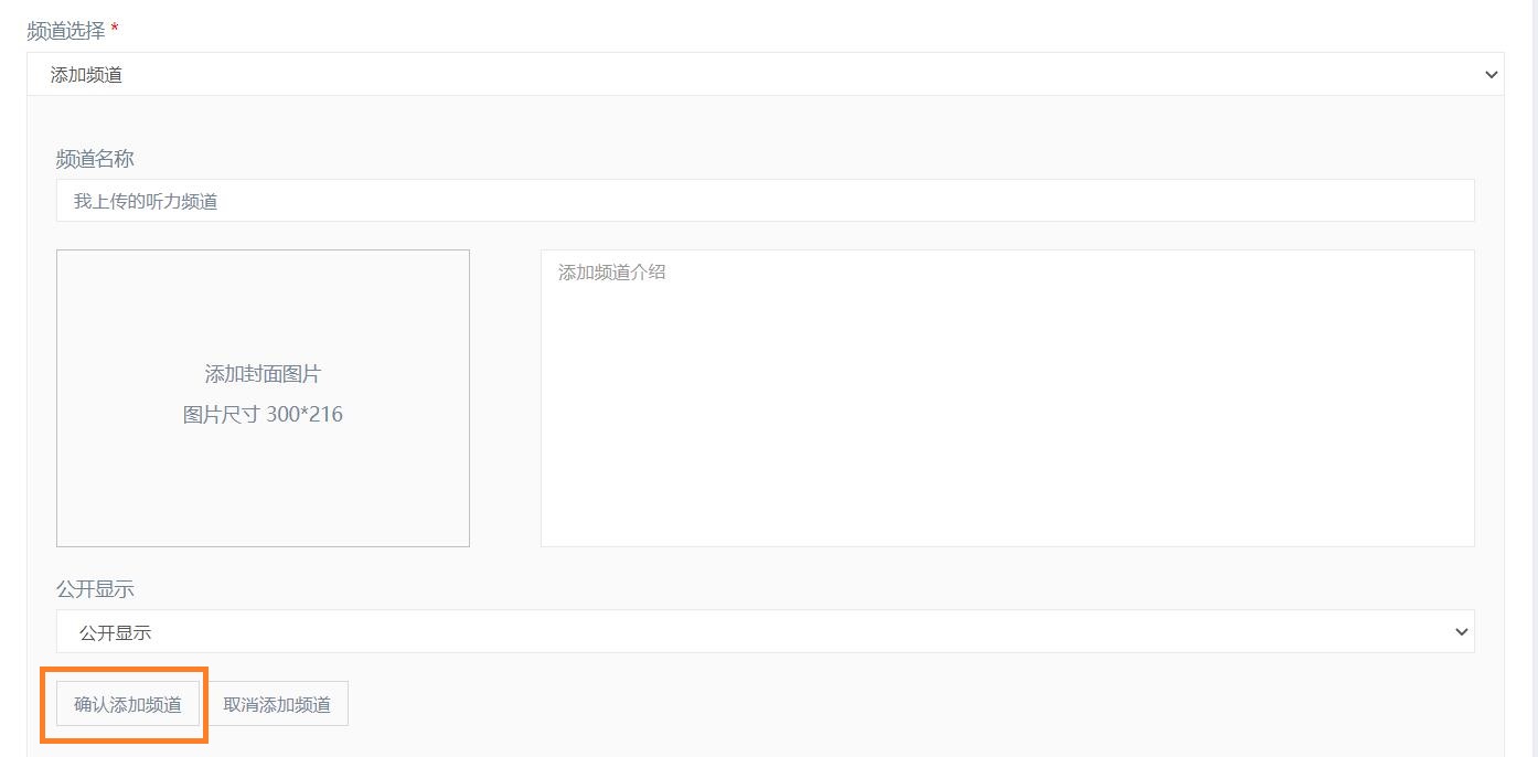 若还未创建过任何频道,需先填写下方「频道名称」、「添加封面图片」等频道信息,然后点击「确认添加频道」,此时频道创建成功,再点击上方「添加频道」即可选择方才创建的频道。