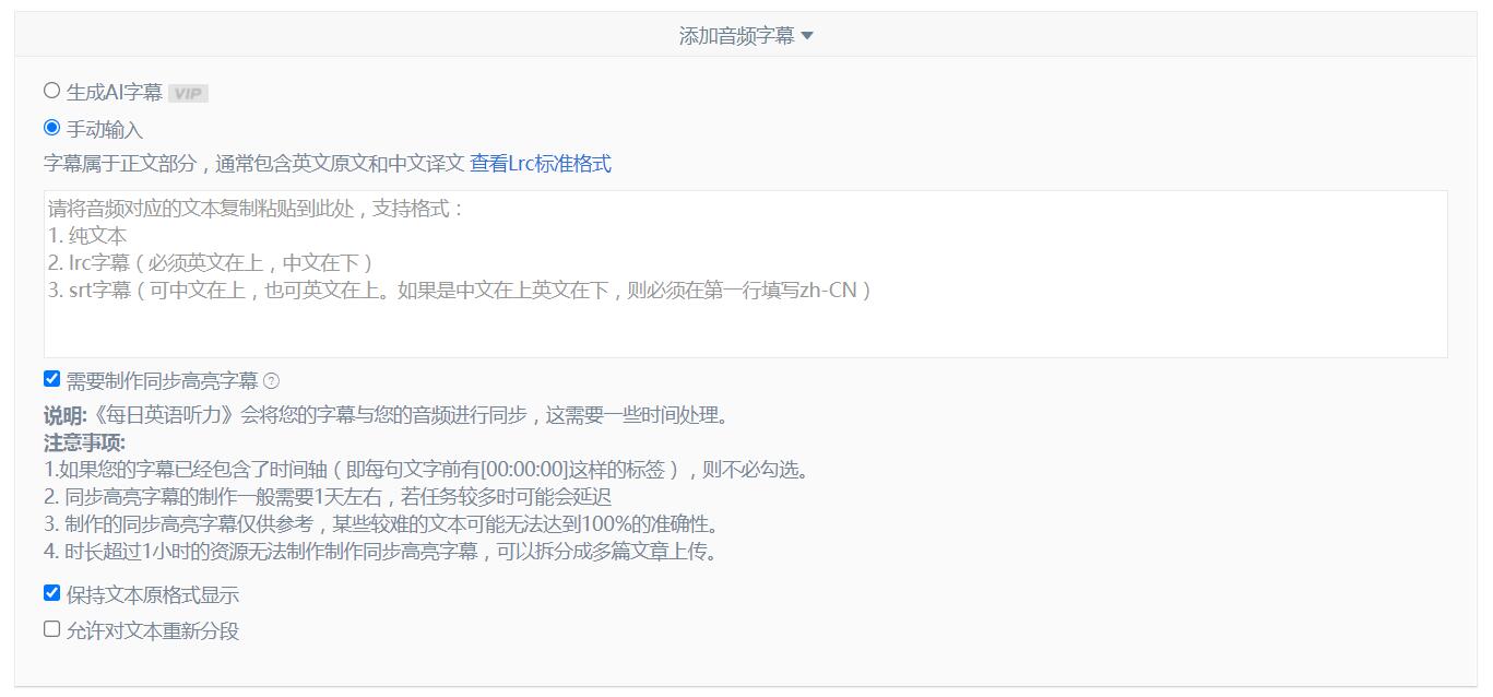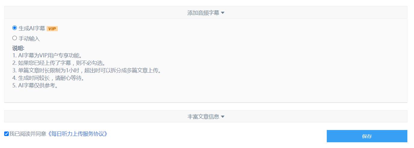 如果你的音频没有配套的字幕文本,那么可以选中「生成AI字幕」,点击「保存」。然后就可以静静等待你的听力文章“出炉”啦!