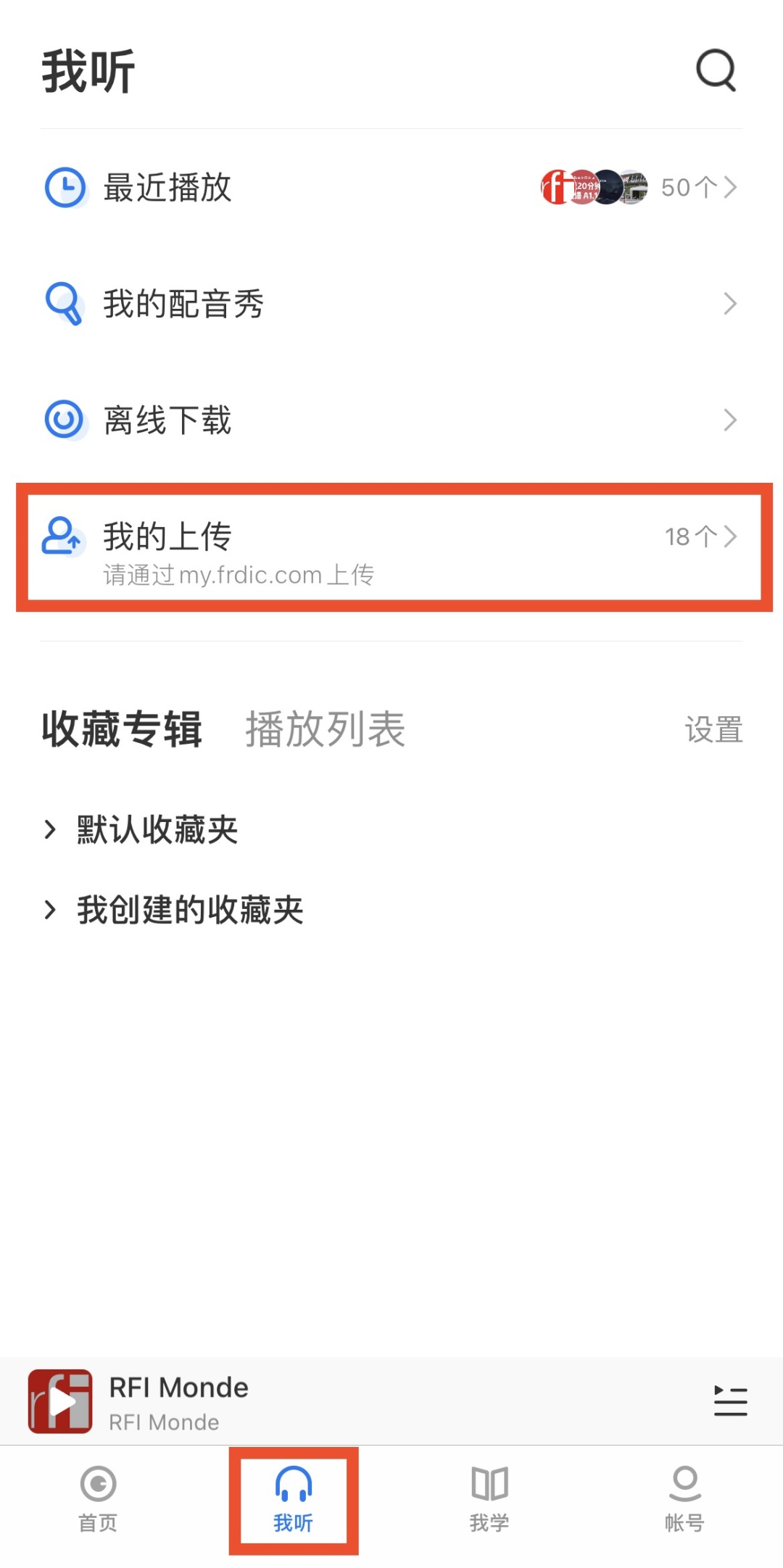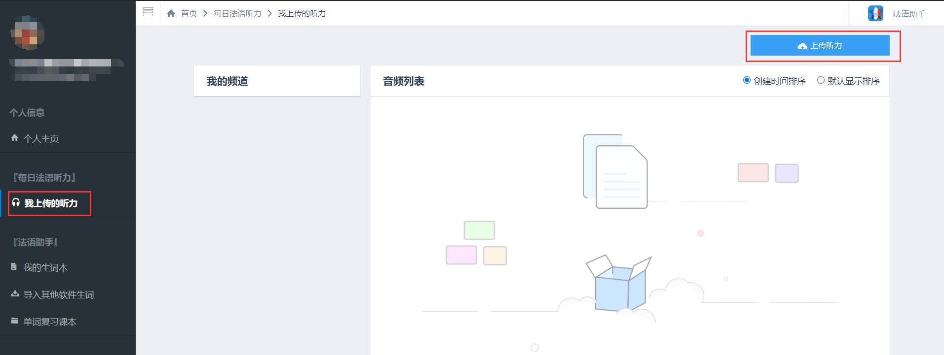 用电脑登录「每日法语听力」的用户后台:my.frdic.com,点击左侧「我上传的听力」,再点击该页面右上角「上传听力」,即可进入上传听力页面。