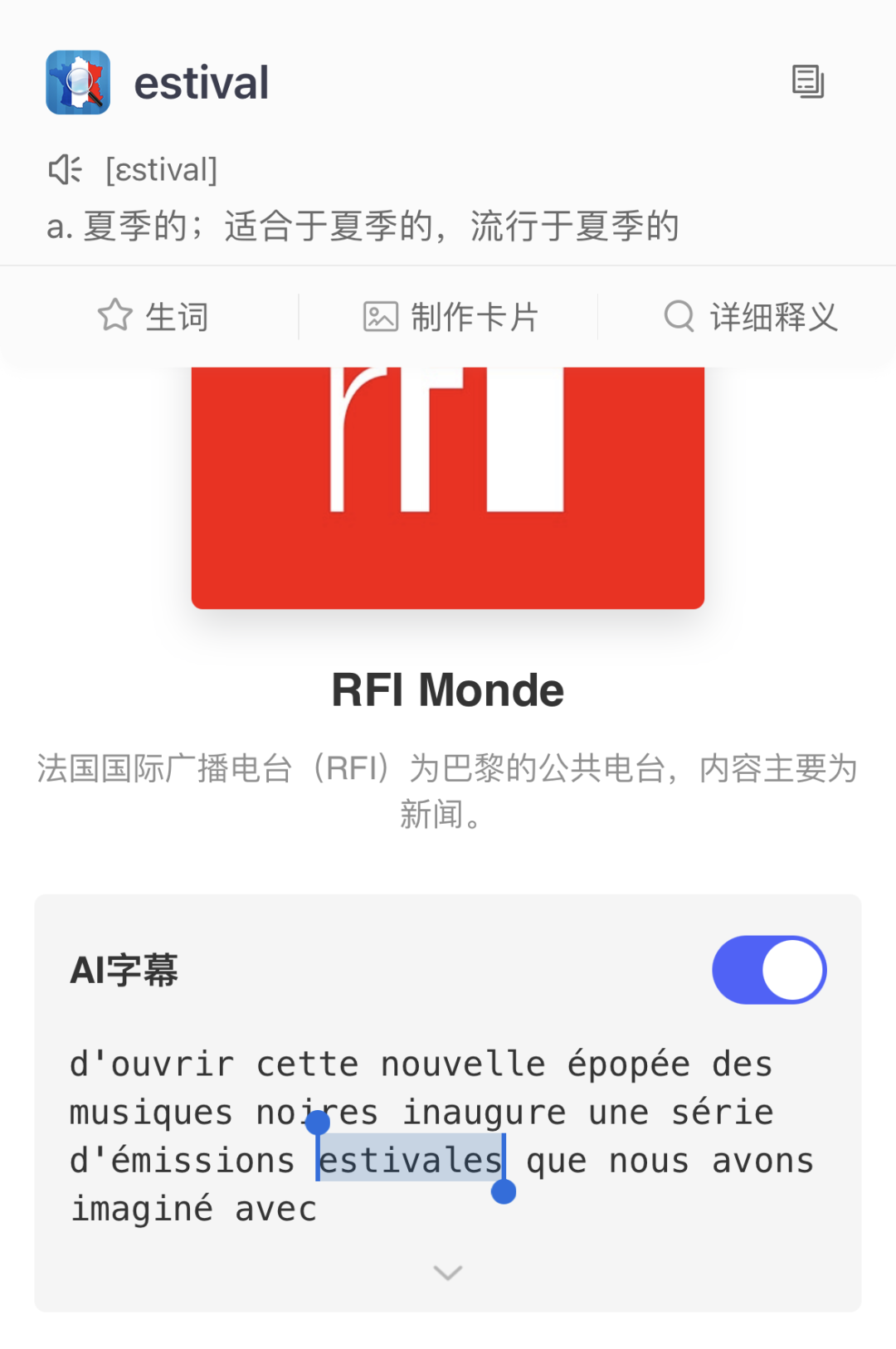 FM法语广播支持AI智能识别字幕文本啦!最新FM新闻报道+实时同步AI字幕,简直是锻炼法语听力的不二之选~长按字幕还可直接查词,再也不怕听新闻听不懂啦!